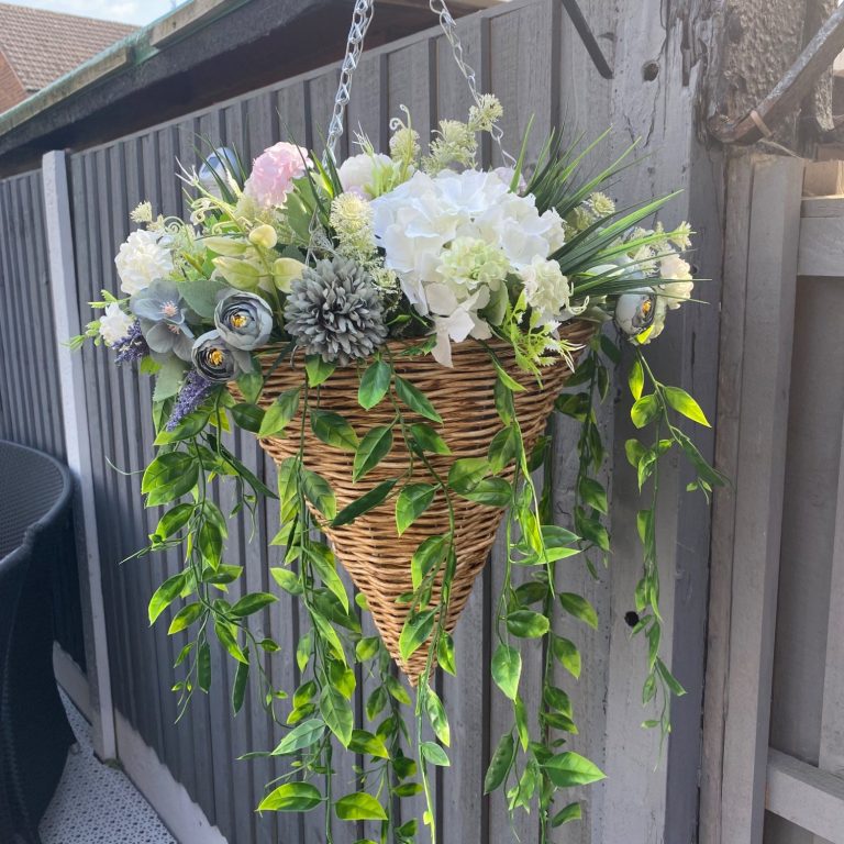 We will refresh your aging hanging baskets with premium, realistic artificial flowers and foliage that look vibrant all year round. No watering, no fading, no seasonal replacements just beautifully arranged, maintenance-free displays crafted with care and creativity. Each basket is thoughtfully styled to suit your space and your budget, whether you’re updating a front porch, garden wall, balcony, business entrance, or indoor feature wall.